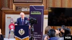 前香港总督彭定康2023年3月27日出席旅英香港人峰会并发表主题演说。(美国之音郑乐捷)