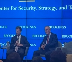 前美国参谋长联席会议主席、退役海军陆战队司令约瑟夫•邓福德(Joseph Dunford 右一)2024年10月2日在布鲁金斯学会举办的活动上讨论美军如何应对来自中俄朝伊等对手的全球威胁,(美国之音薛小山拍摄)